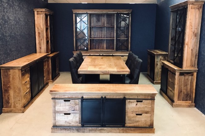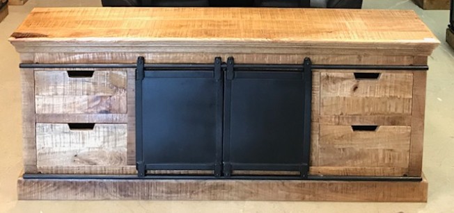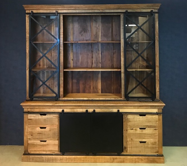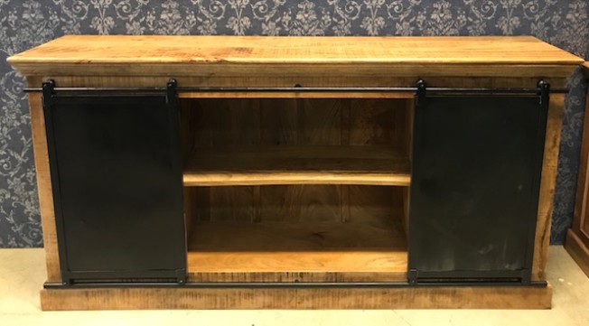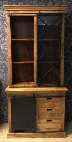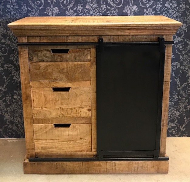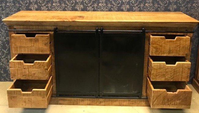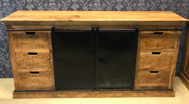 Mozart dressoir: Industriële dressoir van metaal gecombineerd met blank mangohout. Dit dresssoir heeft zwart gespoten metale deurtjes en de laatjes en schappen zijn van mangohout. Het mangohout is naturel van hout en een ware eyecatcher.