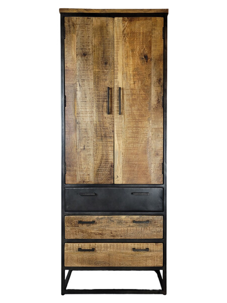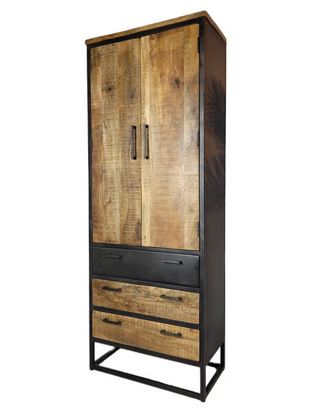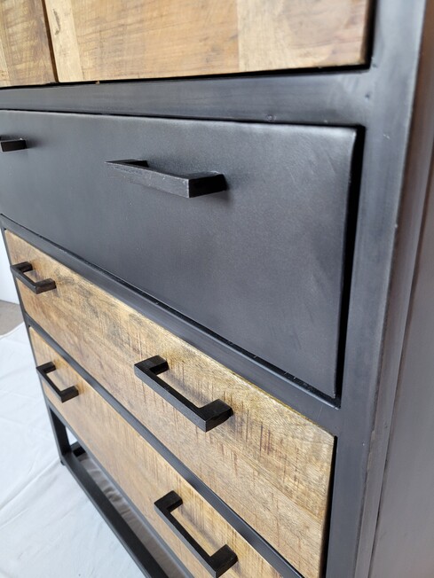 Industriële kast van metaal gecombineerd met blank mangohout. Deze kast is van zwart gespoten metaal, de lades en deuren zijn van mangohout. Het mangohout is naturel van hout en een ware eyecatcher.
