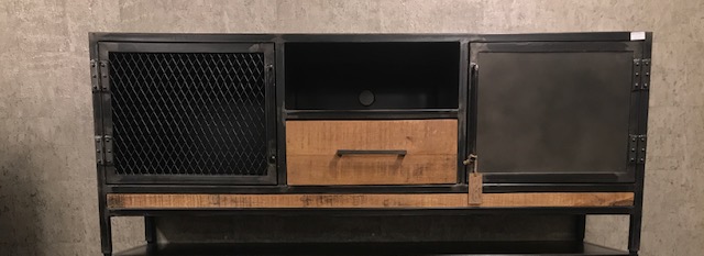 Industriële Tv Kast van metaal gecombineerd met blank mangohout. Deze tv kast is van zwart gespoten metaal, de lades zijn van mangohout. Het mangohout is naturel van hout en een ware eyecatcher.