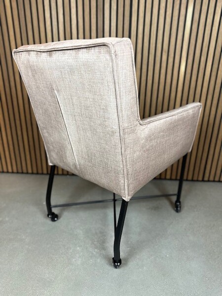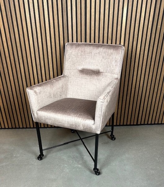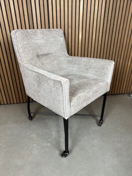 Deze luxueuze Eetkamerstoel op wieltjes is verkrijgbaar in elke gewenste stof.