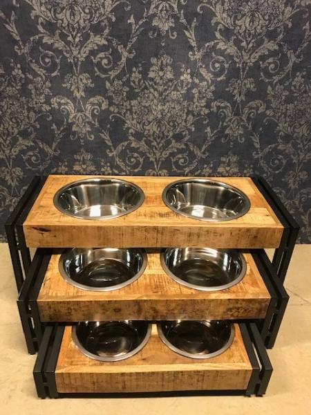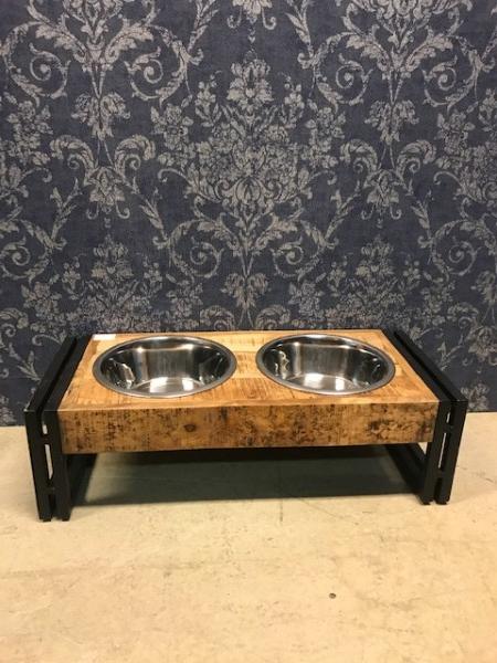 Voederbar van mango hout met een zwart metalen frame, en voorzien van 2 voer/drinkbakken.